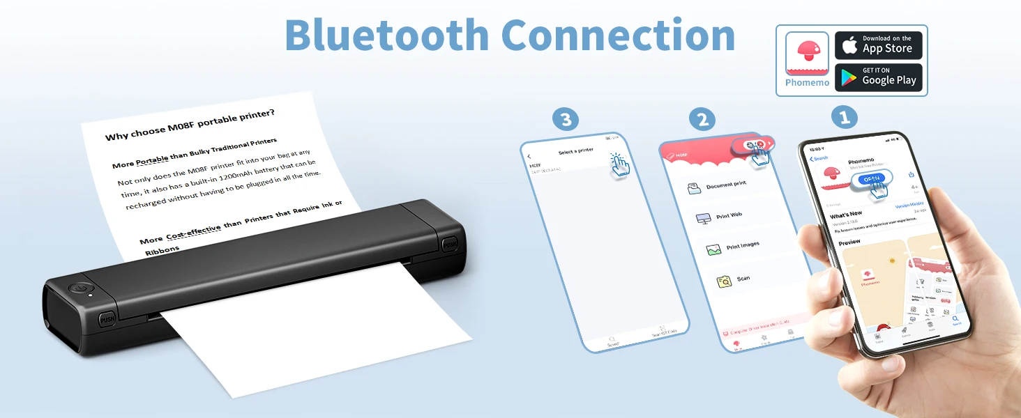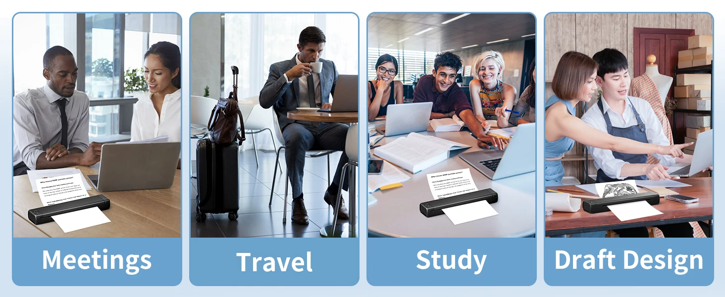 [Multipurpose Thermal Printer] The M08F portable printer can be used to print office documents, study materials, receipts, invoices and many other types of documents to meet your printing needs at home, travel, office, school, car, airport, etc. It is sure to be a surprise gift for business travelers and students on Anniversaries, Christmas and Birthdays. (Warm Tips: only support monochrome printing.)
