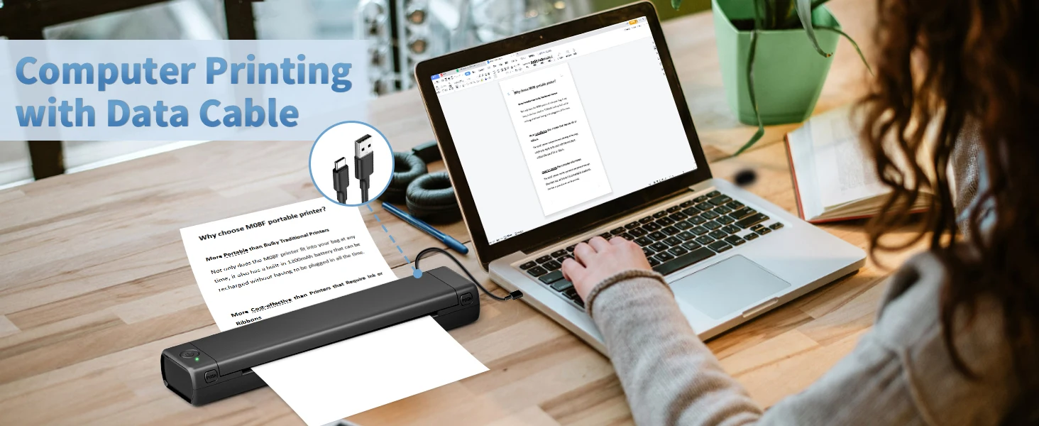 [For Windows and MAC Users] This inkless printer can be connected to MAC and Windows computers with a type-c data cable (Not compatible with Surface series). Steps for the first print: ①Download and install the driver on the M08F official website. ②Connect the printer to your computer with a data cable(MAC PC may need additional adapters). ③Press and hold the printer switch so that the indicator light is always on. ④Feed paper to the printer and select the file to print.