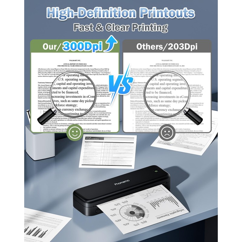 - Ink-Free, Lower Printing Costs: Say goodbye to expensive ink expenses! Phomemo M834 uses advanced thermal technology, eliminating the need for ink, toner, or ribbons, saving you at least 80% on printing costs. With a high print resolution of 300dpi, your photos and documents will display clear and delicate details.