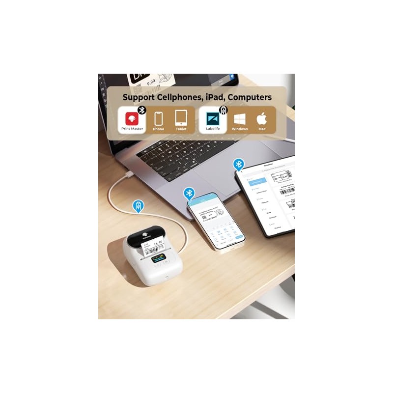 - TAKE YOUR LABELS TO GO: Skip the computer connections, messy wires and clunky ink cartridge. Bluetooth 4.0 connection to your iOS or Android devices(NOT for PC or Mac). The palm-sized and inkless thermal printer weights less than 0.6 pound, makes it to easily slide into bags. Sets up fast and delivers gorgeous monochrome prints that you can peel and stick everywhere