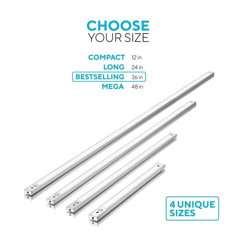 • FREEDOM OF CHOICE! You are welcome to choose between 12 inch, 24 inch, 36 inch and 48 inch under cabinet lights and two different colour temperatures: Warm White 3000K and Neutral White 4000K. Super bright LED and sensitive touch LED sensor makes these light bars way better traditional lights.