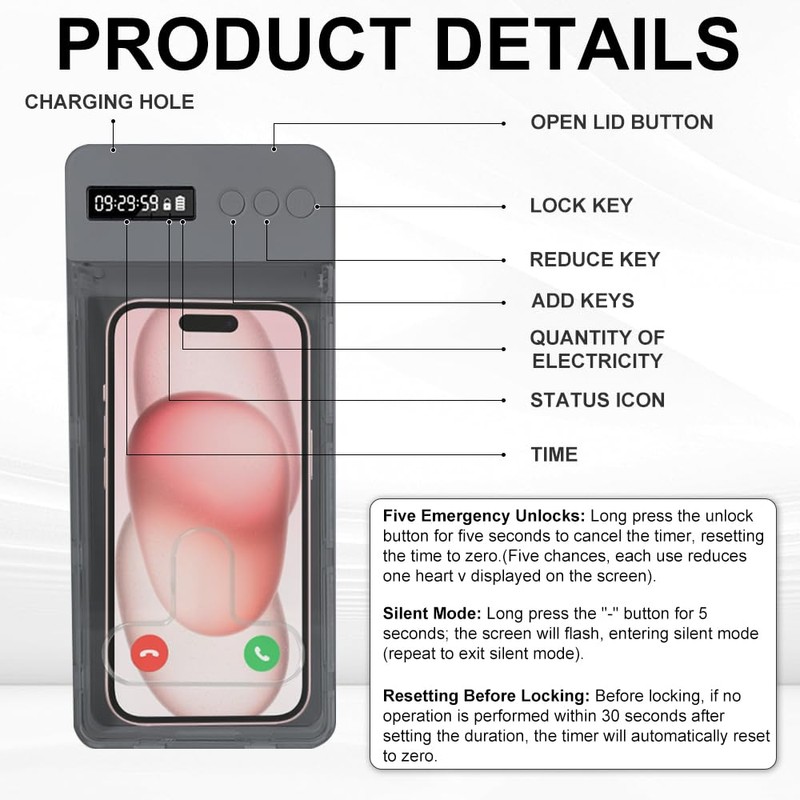 - 【NOTE】Phone Lock Box with Timer has only two chances to open within the set time, please use it with caution. Due to the particularity of the product, please read the instructions carefully before use, and use it in combination with actual conditions to avoid unnecessary trouble