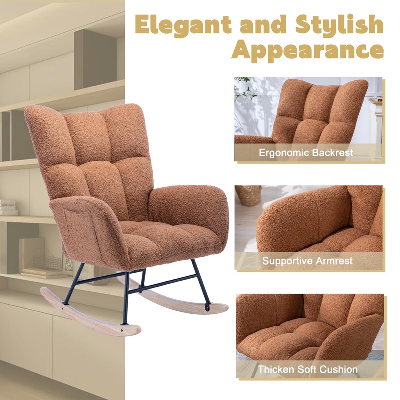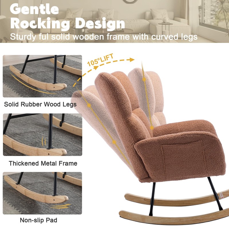 - Comfortable: Covered with soft teddy fabric and filled with a high-density soft sponge, our modern rocking chair can bring you a gentle touch and ultimate seating comfort. The well-cushioned generous seat depth and width provide ample seating space and give you a comfortable experience.