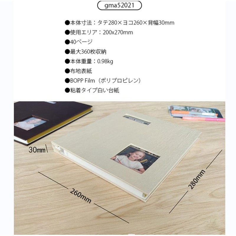 - Product Dimensions: Length 11.4 x Width 10.6 x Height 1.2 inches (290 x 270 x 30 mm) (40 pages); Storage Capacity: 360 sheets; Material: Fabric cover (cotton) BOPP Film (polypropylene) adhesive type white mount