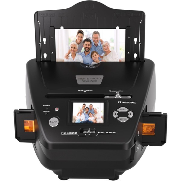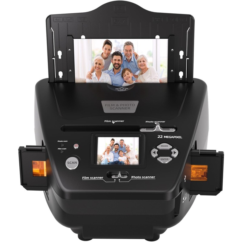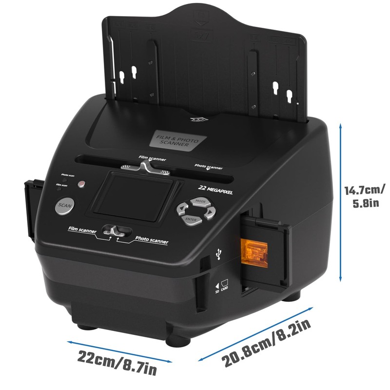 - Film & Photo Scanner: Effortlessly scan your photos, postcards, slides and negatives to the scanner (128MB internal memory) or SD card (included - 4G). Digitize to 22 million pixel high resolution digital JPG images in seconds.