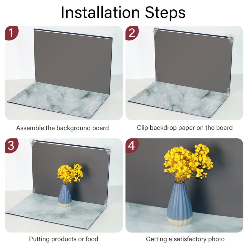 - 【Easy to Use Anytime, Anywhere】:Easy to assemble and disassemble, as well as change the background, while with a carrying bag, you can easily store and carry, easy to use in your studio or when travelling. Great tools for tabletop photography, flat lay photography and front view photography.The protrusions reduce the damage and loss of photo props.