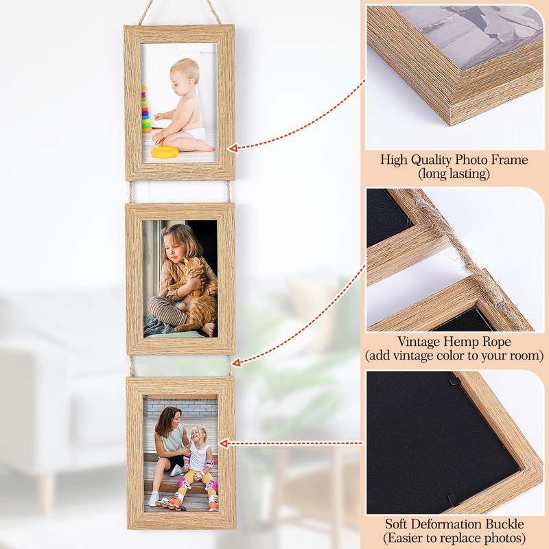 - Picture frames for multiple pictures meet rustic charm! Three textured 4x6 wooden-toned frames linked with jute rope create a cozy, cabin-inspired gallery wall. Perfect for cottages or urban lofts, they turn family moments into art with effortless Canadiana flair.