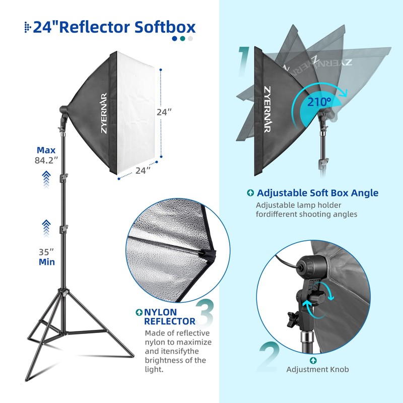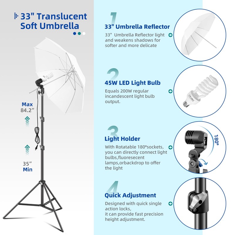 - 20 X 28 inches softbox with white square diffuser for eliminating shadows and softening light flow; 33 inches diameter lighting umbrella diffuses light and weakens shadows for softer and more delicate model portraits and product shots, Adjustable bracket and swivel head: the head rotates up to 210 degrees to give you the perfect shot every time