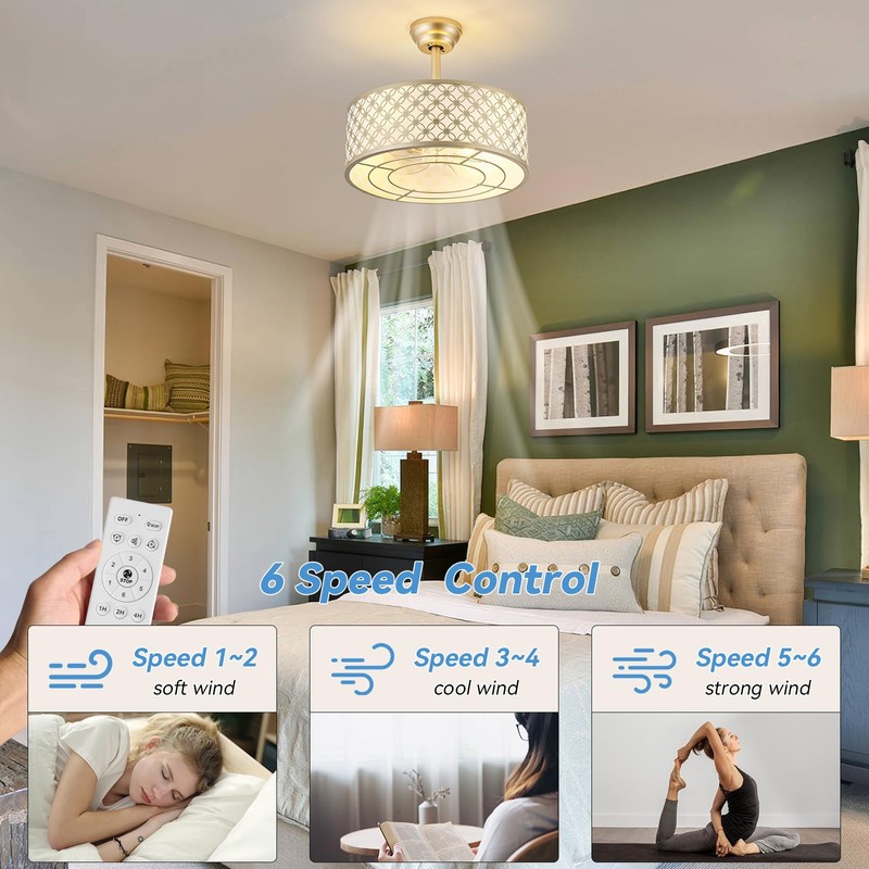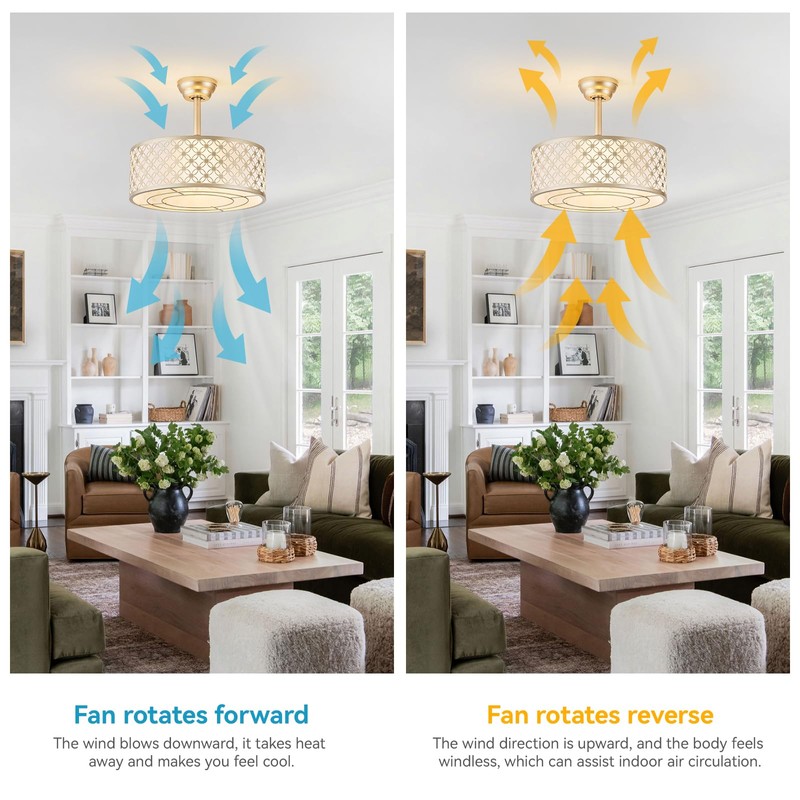 - Tailored Comfort: Customize Your Atmosphere. Transform your comfort level with the Gold Fandelier Ceiling Fan, crafted for personalized experience. Enjoy adjustable fan speeds (1-6 levels) and independent lighting options to create your desired ambiance. Benefit from a whisper-quiet motor that operates in both summer and winter,ensuring you stay comfortable year-round. The included remote control makes managing your fan and light settings easy and convenient.