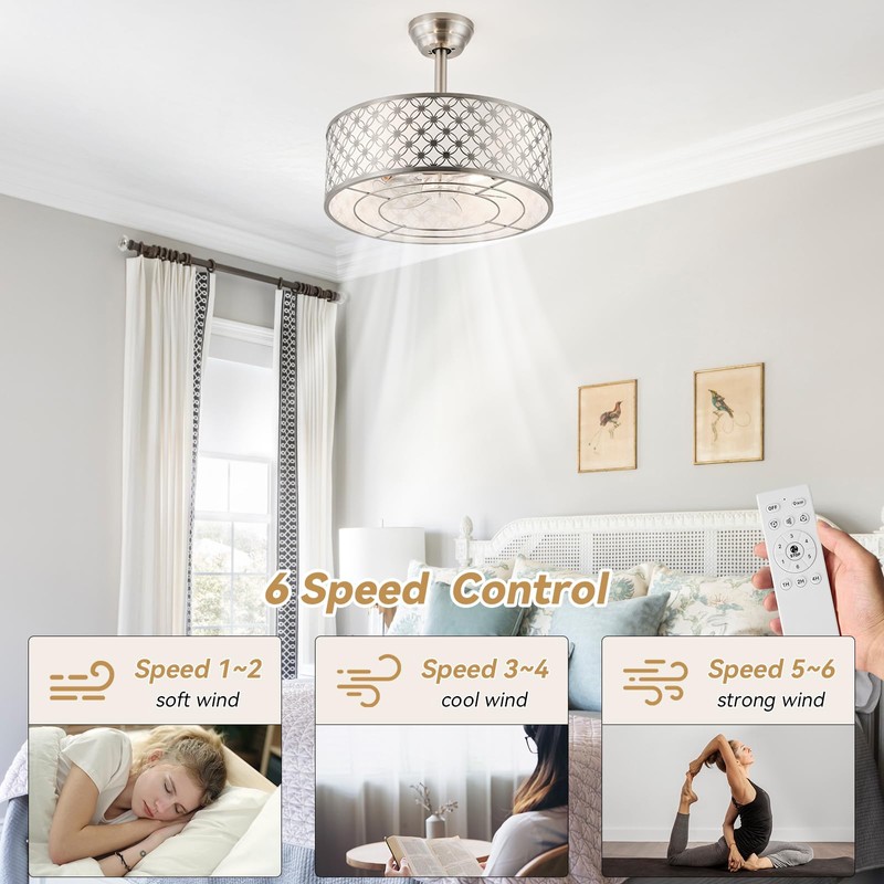 - Tailored Comfort: Customize Your Atmosphere. Transform your comfort level with the Caged White Fandelier Ceiling Fan, crafted for personalized experience. Enjoy adjustable fan speeds (1-6 levels) and independent lighting options to create your desired ambiance. Benefit from a whisper-quiet motor that operates in both summer and winter,ensuring you stay comfortable year-round. The included remote control makes managing your Chandelier fan and light settings easy and convenient.