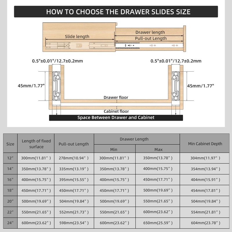 - Universal Fit: These drawer slides are designed to fit a wide range of cabinet sizes, including standard 12", 14", 16", 18", 20", 22", and 24" cabinets. They are compatible with both wooden and metal cabinets.