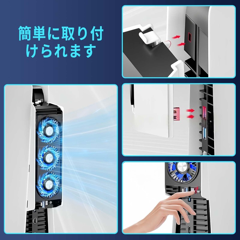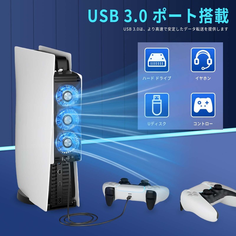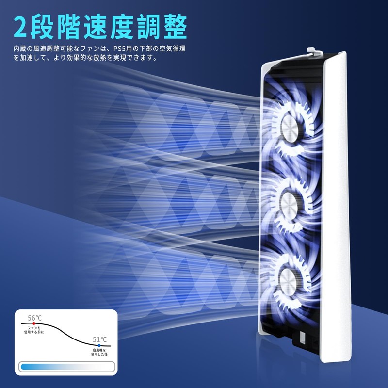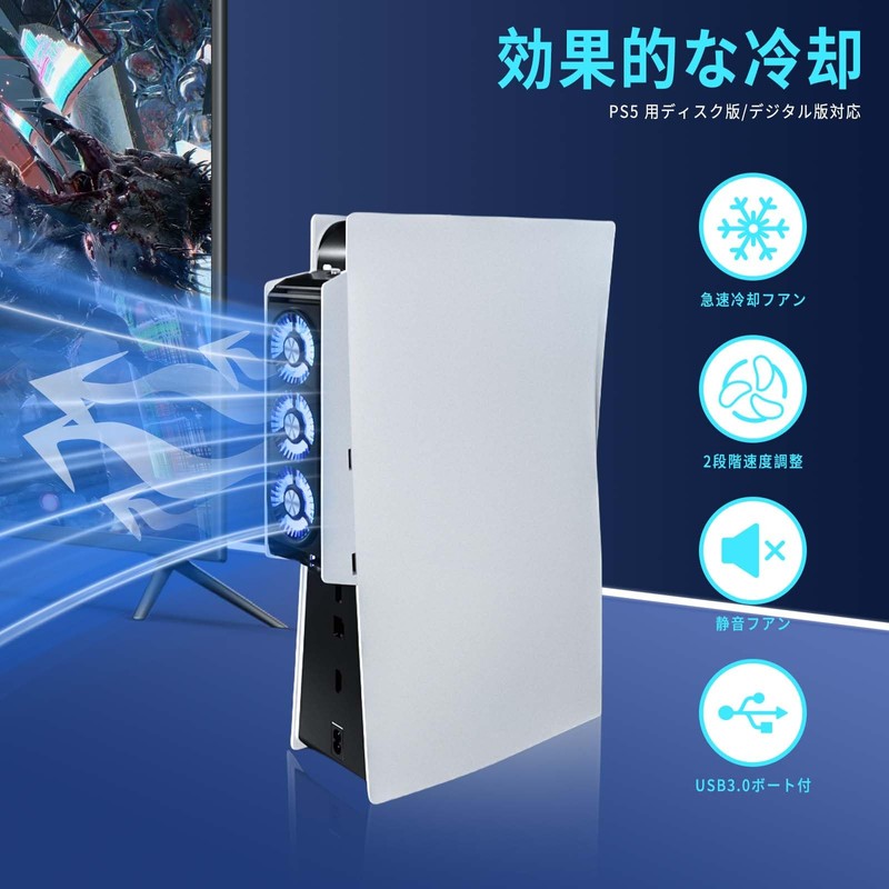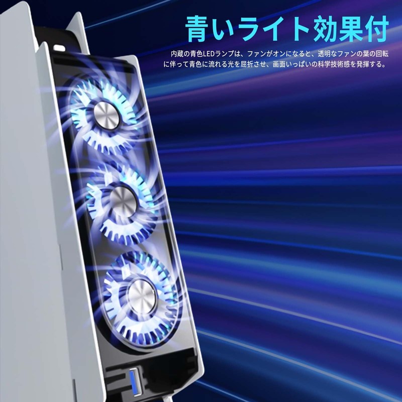 - (Blue Light Effect & Quiet Design) While the PS5 cooling fan is running on the Preste 5 main unit, the PS5 cooling fan has a blue light effect to provide visual enjoyment. The built-in three cooling fans display blue LED lights to remind you that they are working, and when the fan is driving, the blue light refracts as the transparent blade rotation, full of scientific and technical sensation. Besides, the low-noise bearing fan provides a quiet and immersive gaming experience. It will bring you a great game atmosphere!
