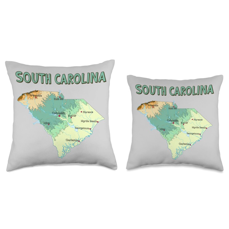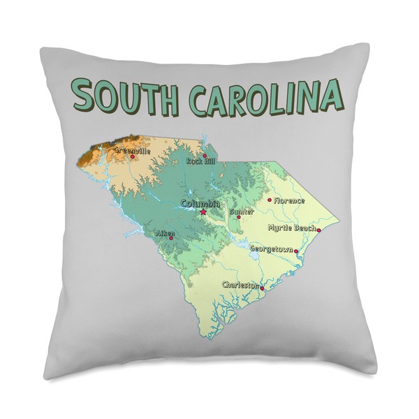Physical Map of South Carolina, major cities, lakes, rivers Throw Pillow