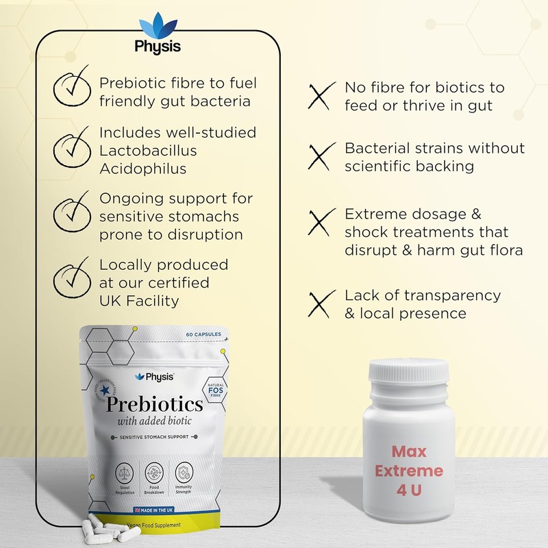 Physis | Prebióticos con Probióticos | Salud Digestiva & Intestinal | Alivio Diarrea y Estreñimiento | 60 Cápsulas Veganas | 2 Meses | FOS + Lactobacillus Acidophilus