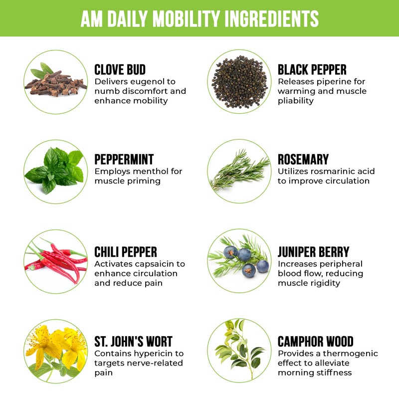 - AM Herbal Rub for Circulation & Mobility: The AM rub features a blend of ingredients such as chili pepper, clove, black pepper, and ginger known to enhance circulation, reduce stiffness and improve mobility. This formula delivers a long lasting warming sensation so you know that it is working. Ideal for everyday mobility needs, pre-workout routines. One application supports all-day comfort and ease of movement, making it a great option to start your day and stay active.