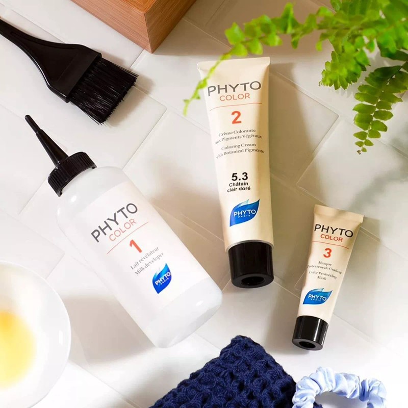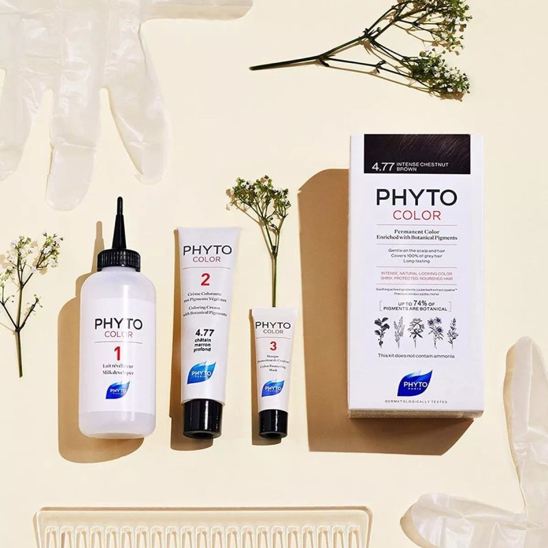 PHYTOCOLOR es un tinte de color de cabello permanente enriquecido con pigmentos botánicos hasta un 74%* de 5 plantas de tinte, garantiza un tono intenso natural, brillo extremo y reflejos brillantes.