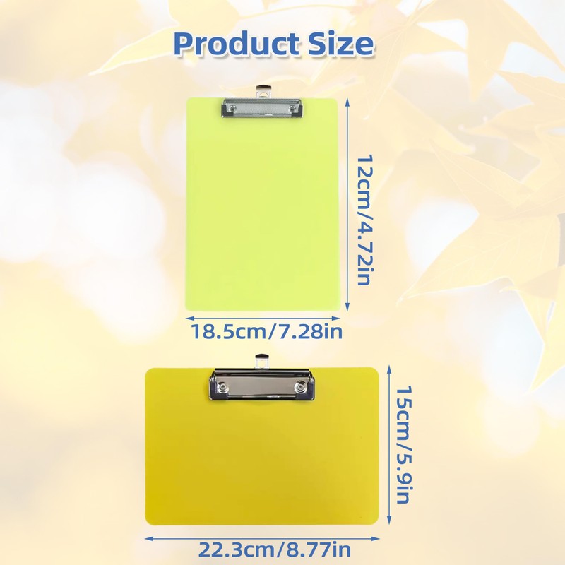 This plastic clipboards measures 22.3x15 cm/9x6 in and 15.2x12.7cm/5x6 in , one is vertical and the other is horizontal, there are two different styles to choose from for your different needs, convenient to use