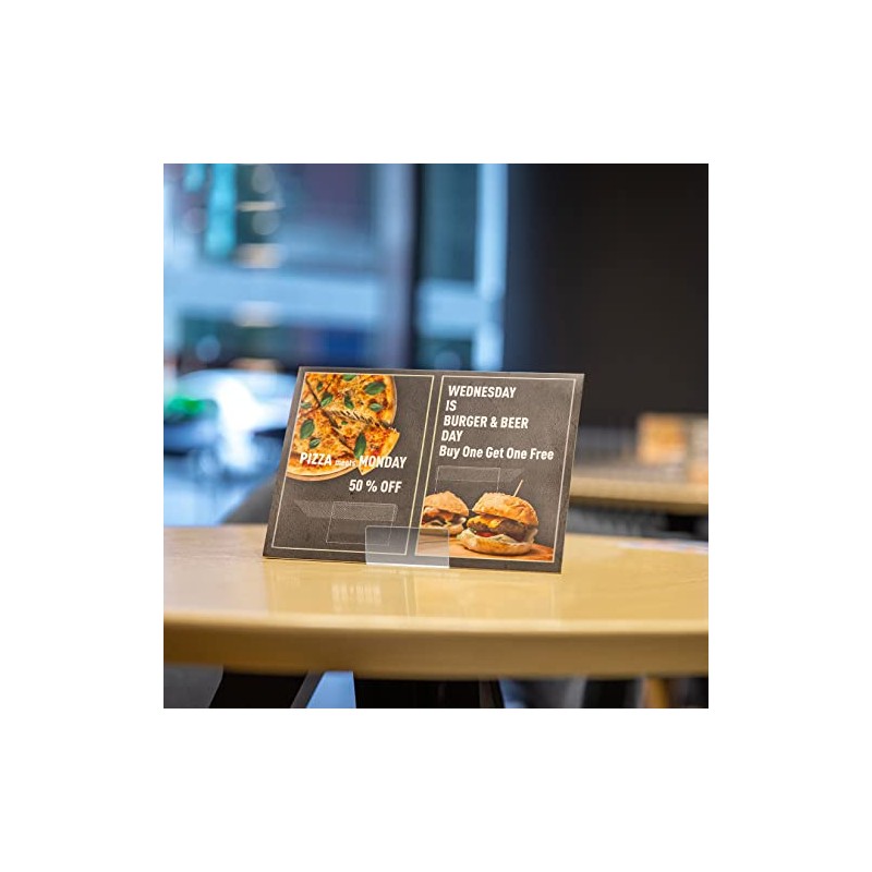 - Practical DesignThe poster menu holder can stand on its own, there is no need for anything else to set it stably on a desk. The holder is transparent and designed to lean back to provide a better line of sight to read the information placed in the holder.