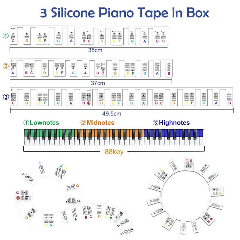 - HIGH QUALITY MATERIAL The music strips are made of durable silicone and come standard in a row of tabs. No creasing after use, which extends the life of the piano letter stickers. They do not disturb your fingers while playing, are easy to install and stick perfectly to the keyboard.