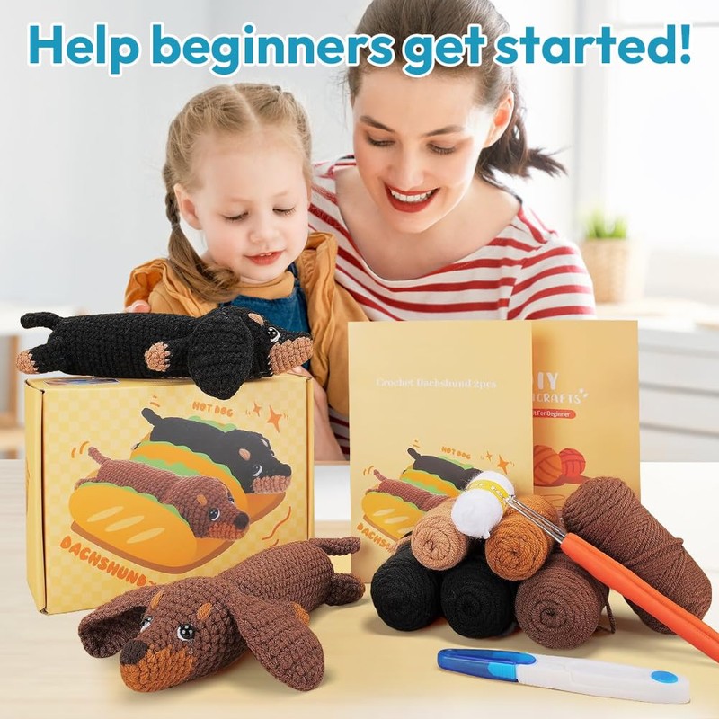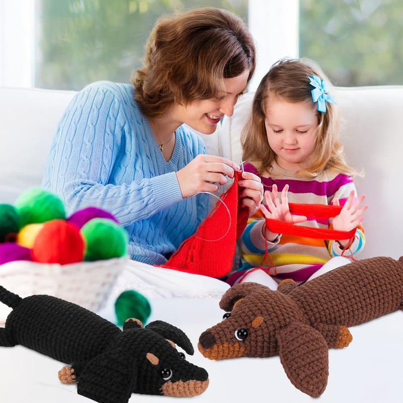 - Easy to get started and fun to design: Includes 2 brown and black dachshund crochet sets, specially designed for beginners. Each set contains a gift box, plenty of yarn, detailed instructions, step-by-step video instructions, 2 crochet hooks and 8 eyelets, 5 knitting markers, 1 needle, filling and scissors. Whether you practice or craft creative crochet animals yourself, you can do your work easily and with pleasure.