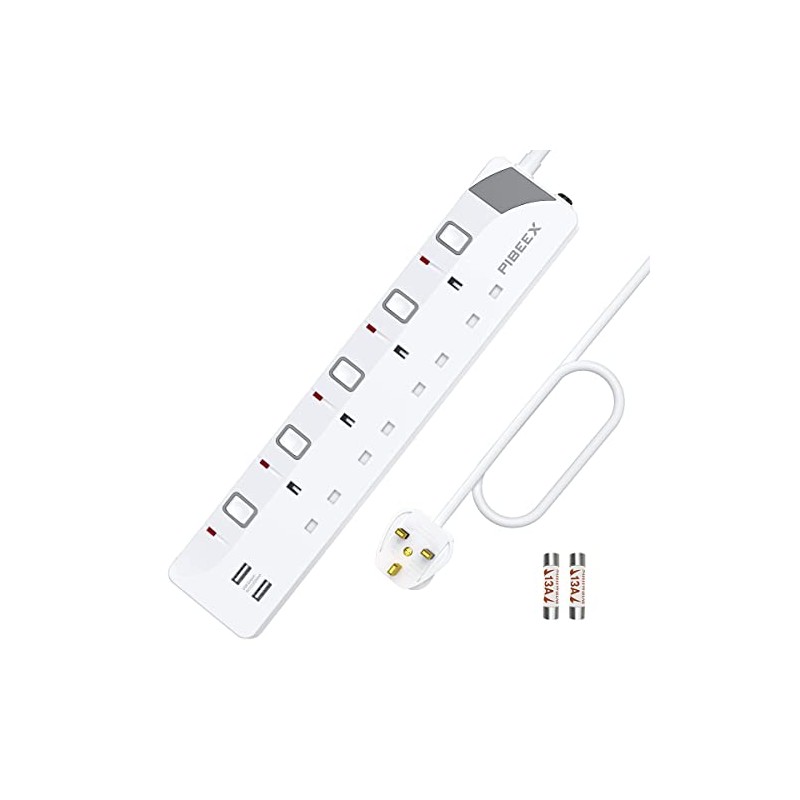 PIBEEX Extension Lead with 4 Way Plug Sockets, 13A, Individual Switches, 2 USB Ports, 2M Extension Cord, 3250W Power Strips for Mounting