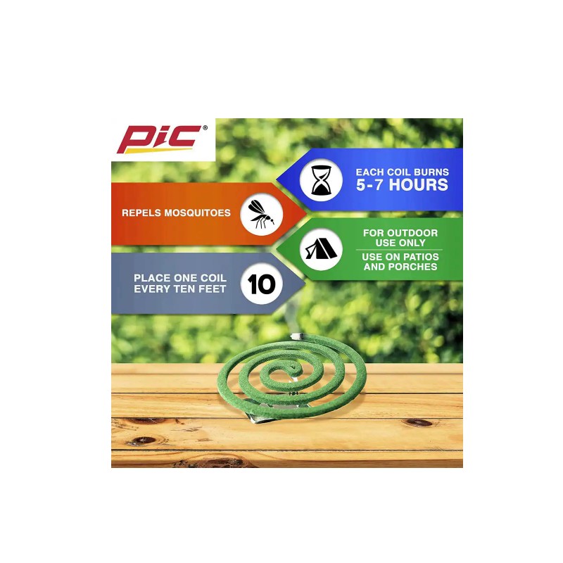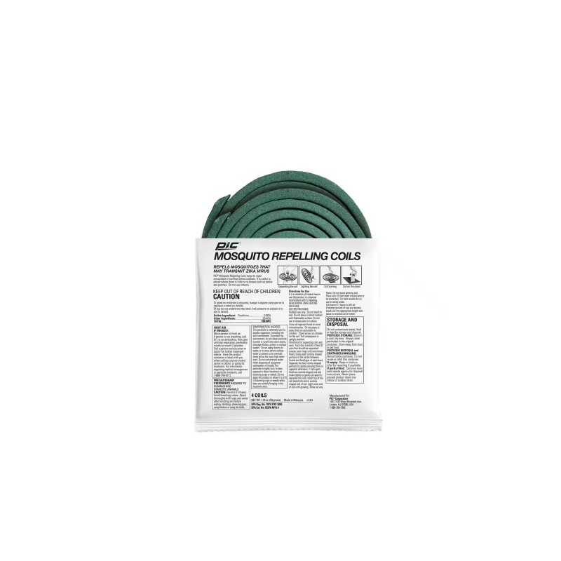 The Mosquito Repellent Coils (4-Pack) by Pic is a green coil designed to repel and deter mosquitoes, fleas, and ticks outdoors. Made of plastic and metal, each coil provides 250 hours of prevention and weighs 1.68 oz. Manufactured in the United States, this product is perfect for camping, hiking, and other outdoor activities. The convenient 4-pack ensures you have an ample supply to keep insects at bay during your adventures.