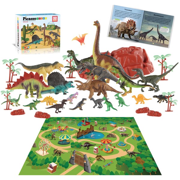 PicassoTiles Dinosaur Play Mat Toys 32pc Dino Playset STEM Activity Learning Kit STEAM Toy with Educational Book, 21 Action Figures T-Rex, Triceratops, Velociraptor, Trees, Rocks for Kids 3+ PTD11
