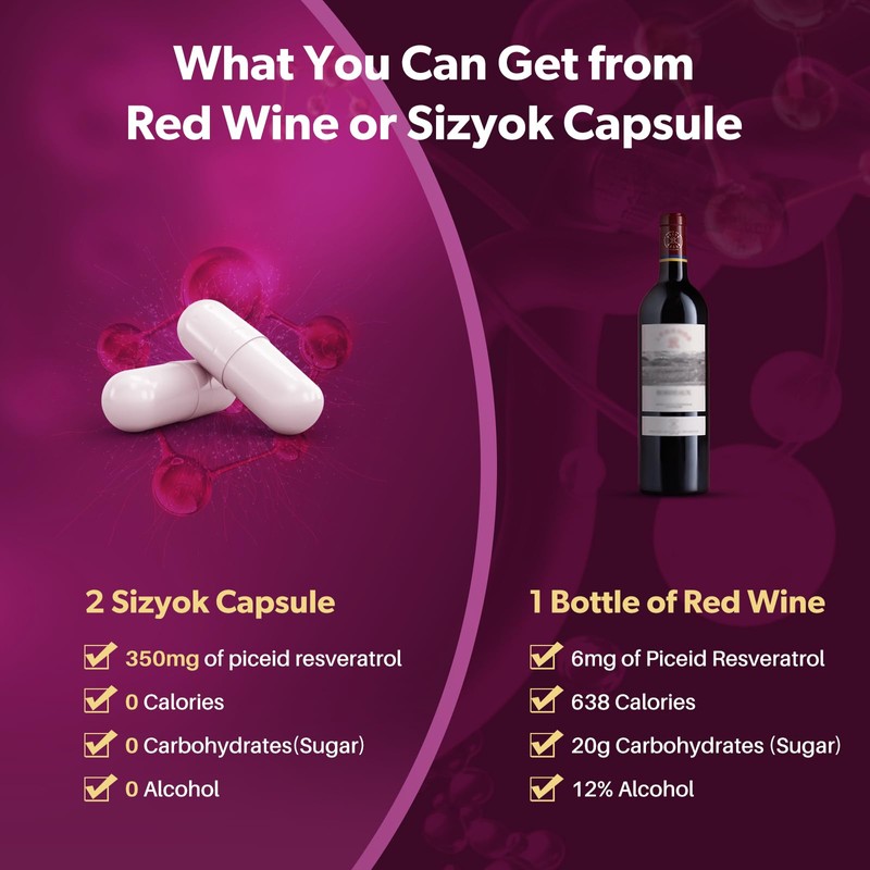 - Sizyok Ultra High Purity Resveratrol Supplement: This is a Full-spectrum red grape cell superfood containing polyphenols including Piceid Resveratrol which 143% extracted from red grape. Sizyok use the latest extraction technology" Ultrasound-Assisted Two-Phase Aqueous Method" to greatly improve the extraction rate of Piceid Resveratrol from red grape, and extract Piceid Resveratrol with higher purity and bioavailability from red grape.