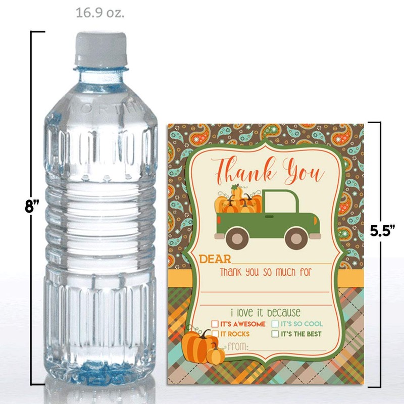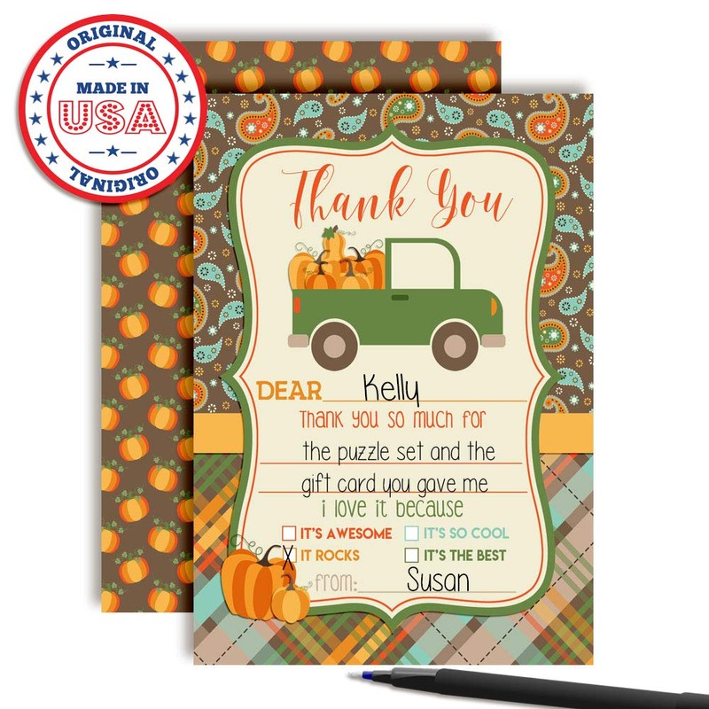 Pick Up Truck Full of Pumpkins Birthday Party Thank You Notes for Kids, Ten 4" x 5.5" Fill in The Blank Cards with 10 White Envelopes by AmandaCreation