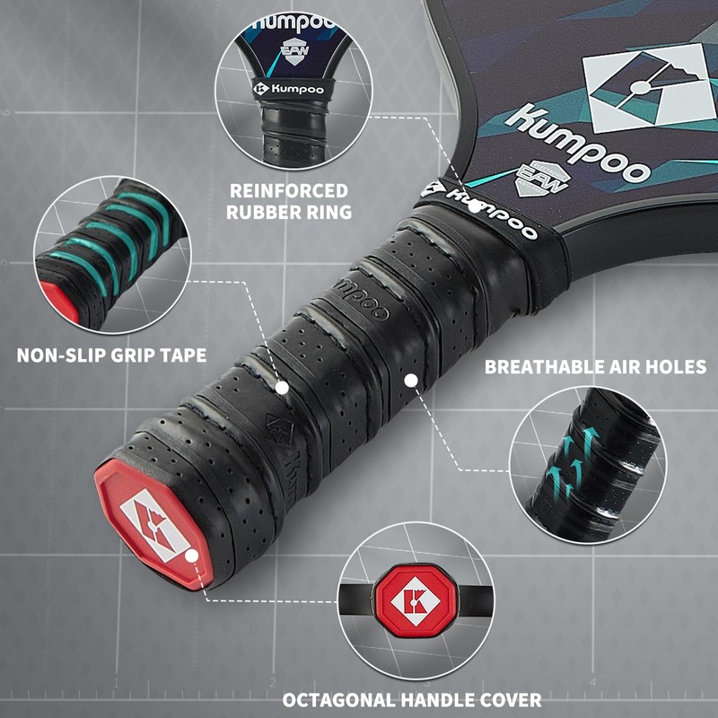 • 【Sweat Absorption and Anti-Slip Handle】Designed for ultimate comfort, our paddle features a shock-absorbing grip that excels in sweat absorption and anti-slip performance. The protective silicone cap safeguards the handle, while the streamlined design minimizes air resistance for effortless swings. The grip circumference of our Pickle ball Paddle is 4.25in.