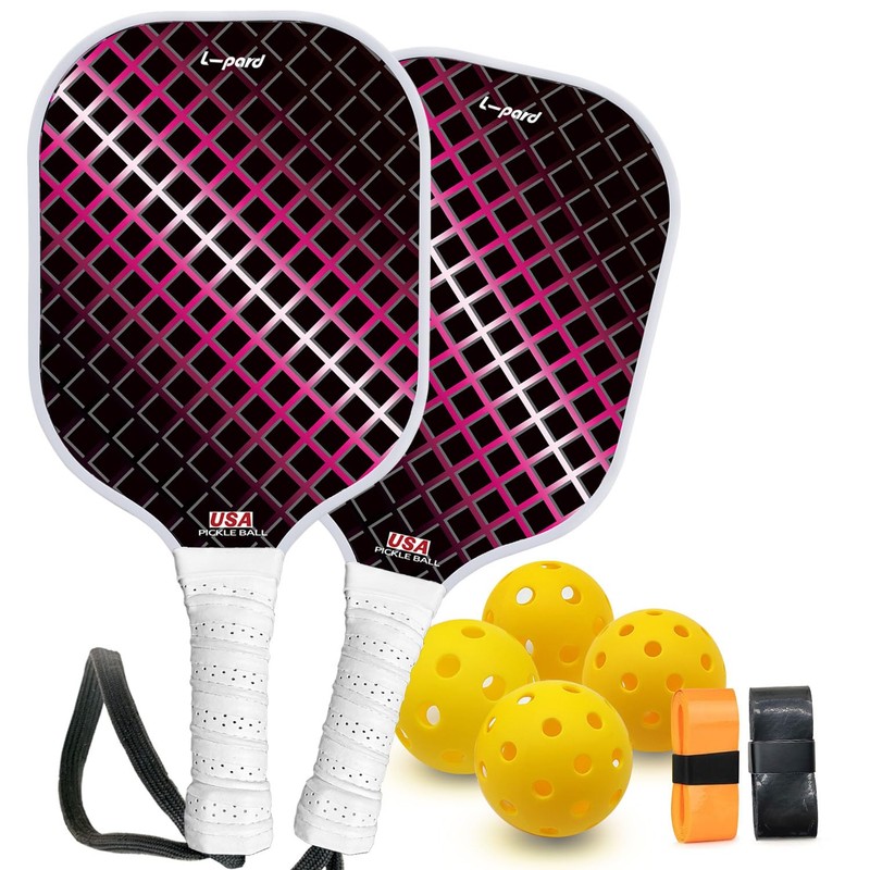 Pickleball Paddles,Fiberglass Surface Pickleball Set with 2 Pickleball Rackets and 4 Pickleballs, Pickleball Paddle Set and Pickle Ball Set for Men, Women, Kids, Adults (Grid Pink)
