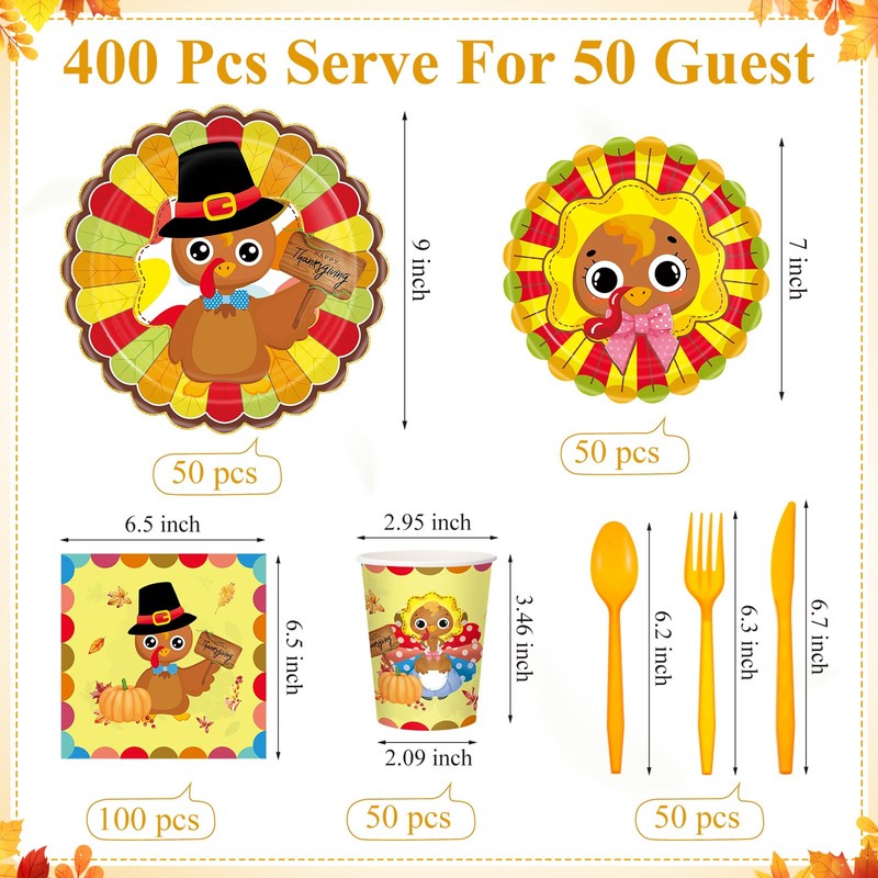 Pickmesh 400 Pcs Turkey Thanksgiving Party Supplies Include Disposable Paper Plates Napkins Cups Cutlery Harvest Dinnerware for Fall Autumn Thanksgiving Party Decorations Serve 50