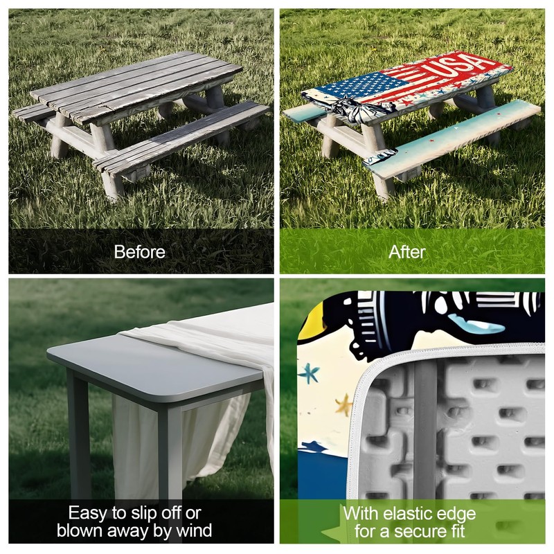 - 【EASY INSTALL & WINDPROOF】Both table cover and bench cover designed with all around elastic, not only can prevent unexpected movements and stay firm in windy conditions, but also easy to install and uninstall by yourself, so your happy picnic time won't be disturbed.