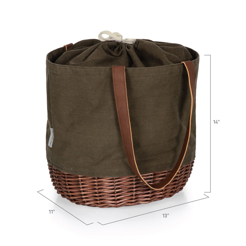 - Combination picnic basket and picnic tote that has a handwoven wicker bottom and canvas upper body