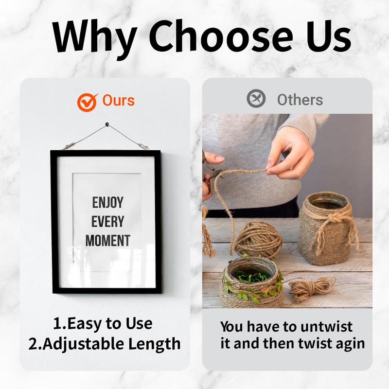 - Versatile Applications:This Picture Hanging Wire Kit is perfect for a wide range of applications. It can be used to hang pictures, mirrors, frames, billboards, and other home decorations. The adjustable Picture Wire ensures that you can achieve the perfect placement for your items, making your home look stylish and organized. Whether you are decorating a living room, bedroom, or office, this kit provides a versatile and reliable solution for all your hanging needs.