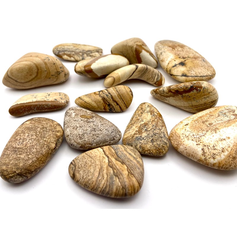 - DETAILS: Picture Jasper flat shaped crystal tumbled stones - 1 piece.