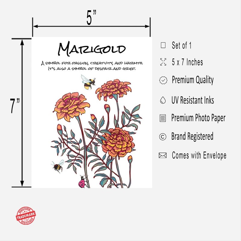 - Charming Marigold greeting card: Celebrate October birthdays with this elegant Marigold flower card. This 5x7” card with envelope highlights the beauty and symbolism of passion, creativity, and warmth.