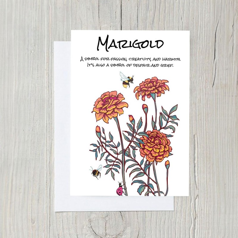 - This card embodies the passion and creativity of the Marigold flower. Ideal for anyone who appreciates timeless floral art and meaningful symbolism.