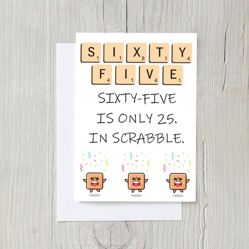 - Funny 65th Birthday Card (5x7”): Celebrate a Scrabble lover's birthday with this hilarious milestone birthday card that plays on the point value of "sixty-five" in the classic word game.