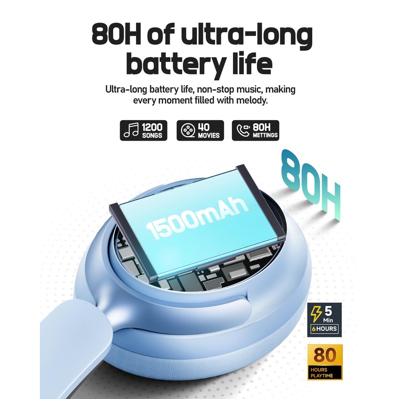 - 【80H Battery Life & Fast Charging】With ANC off, these headphones offer up to 80 hours of playback. Just 5 minutes of charging gives you 6 hours of use. A full charge lets you listen to 1,200 songs, watch 40 movies, or attend 60 meetings. For extended use, switch to wired mode. Perfect for long trips. (Includes Type-C charging cable and 3.5mm audio cable.)
