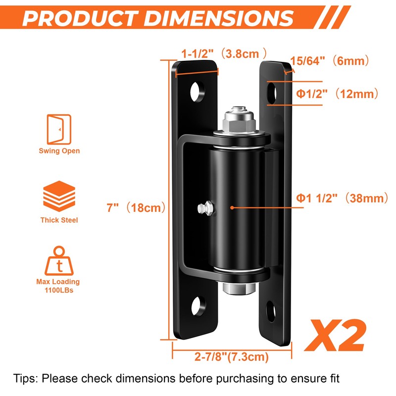 - 1100 LBs Load Capacity: Engineered for strength, each gate hinge supports up to 1100 LBs—making them a top choice for massive driveway gates, farm entrances, or industrial barriers. The reinforced pivot system distributes weight evenly, preventing sagging and ensuring smooth operation year after year. No more worries about gate collapse!