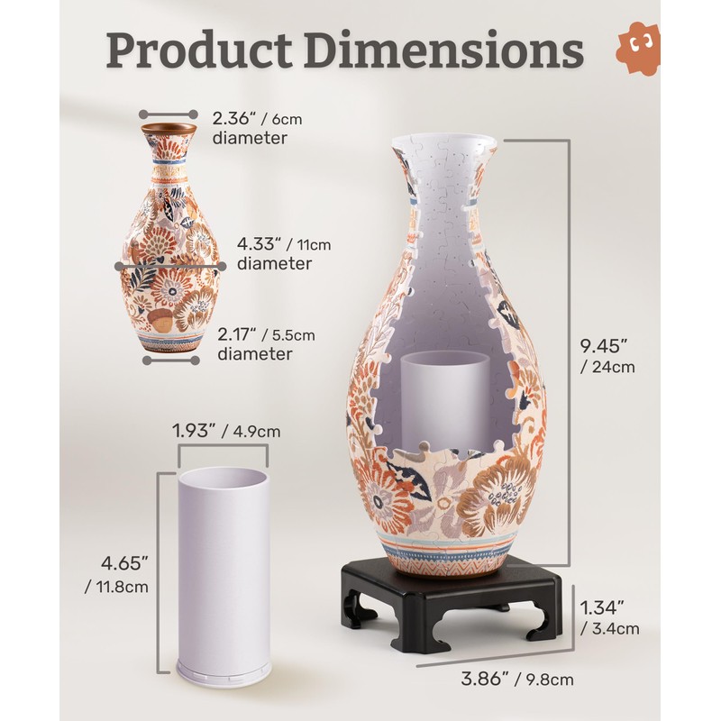 • Unique Flower Vase - Made by -piece d curved puzzle pieces with a detachable water cup and stand. The finished size is . inches in diameter and . inches in height without a stand.