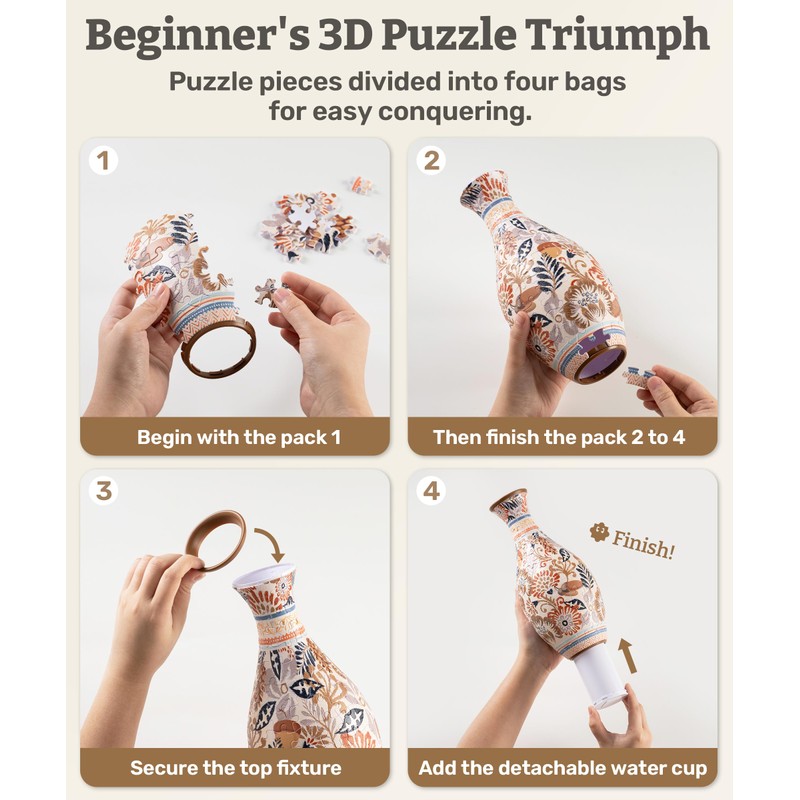 • Perfect Combination of Beauty and Brains - The curved jigsaw puzzles are connected firmly without glue, allowing you to display or use the finished D puzzle vase for flower arrangement after assembling it right away.