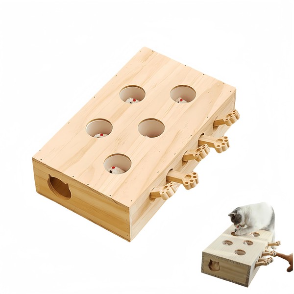 Piegricdiat Whack-a-Mole Interactive Cat Toy,Eco-Friendly Wooden Activity Center with 3 Holes for Engaging Indoor Play & Exercise (Five Holes)