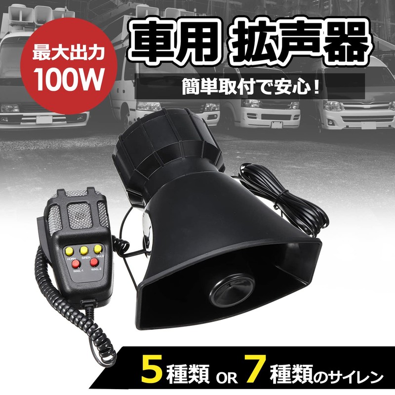 • This in-car loudspeaker has 5 different types of sounds, 7 different siren sounds and a large microphone with built-in amplifier. 100W max output, 12V loud 300dB Handheld microphone for siren, voice adjustment. Election Patrol, Outdoor, Marine, Recovery and more