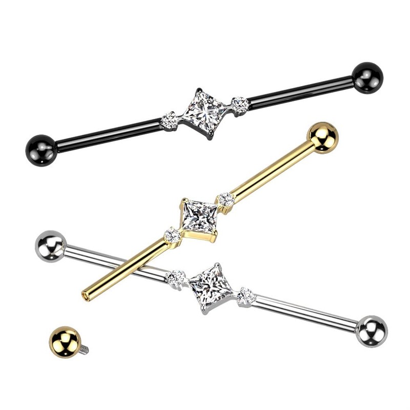 - STYLE: 2 Round CZ Crystals and Square Crystal Center Internally Threaded Industrial Barbell