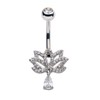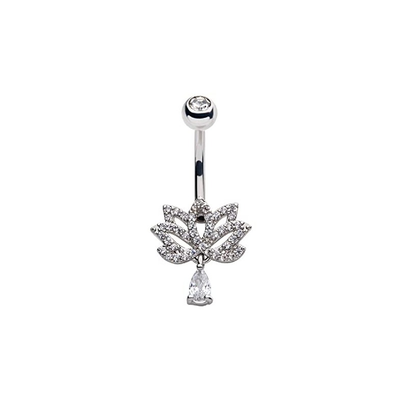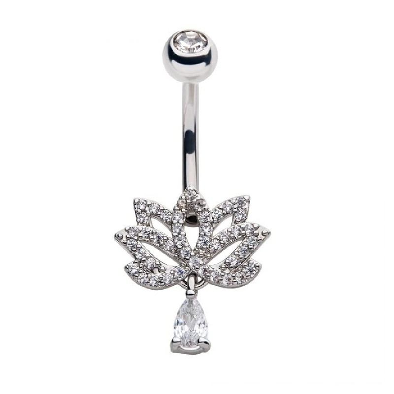 - STYLE: Multi Clear CZ Paved Lotus Flower with Dangling CZ Teardrop Navel Belly Button Ring
