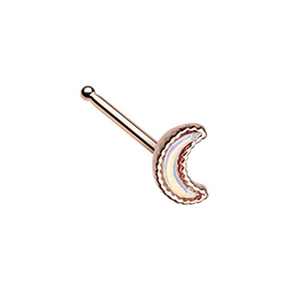 This gorgeous nose bone stud features a crescent moon design with a white synthetic opal center.