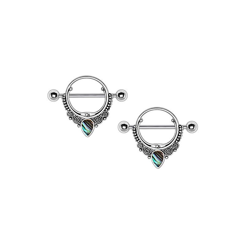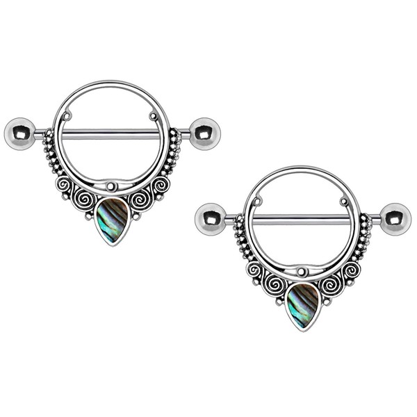 Pierced Owl Stainless Steel Abalone Teardrop Ornate Nipple Shields, Sold as Pair