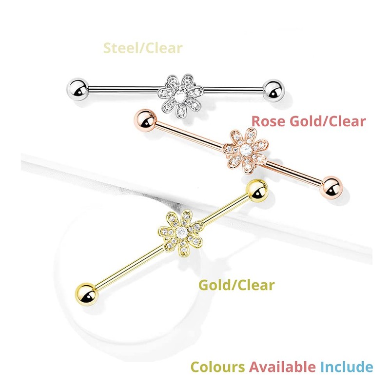 PiercedOff 316L Surgical Steel Externally Threaded Clear CZ Paved Flower Industrial Barbells - Thickness 14GA (1.6mm) / Length 38mm / Ball Size 5mm
